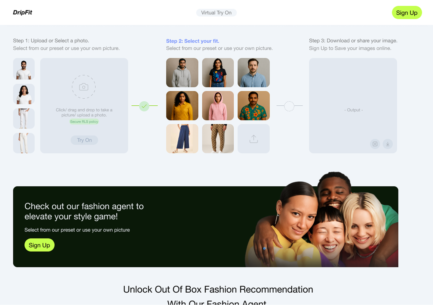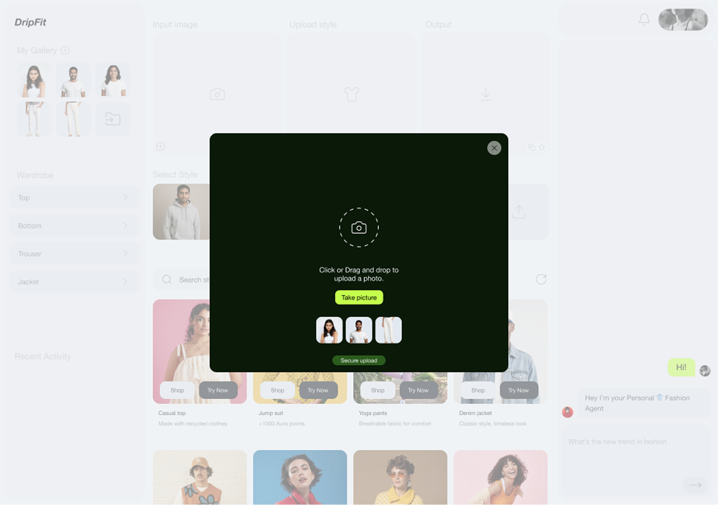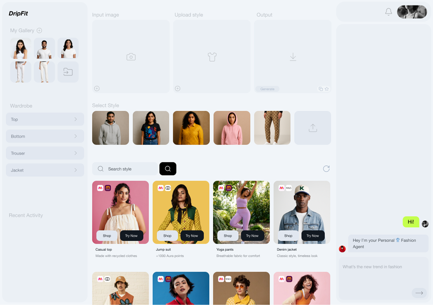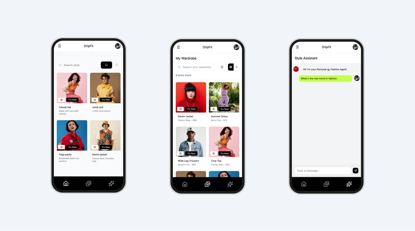 Dripfit is an AI-powered fashion marketplace designed to help users discover, shop, and personalize outfits that match their unique style.The platform allows users to upload a photo and instantly receive outfit recommendations based on visual analysis and personal taste. Users can shop recommended products directly within the app and save items to a personalized wardrobe, which continuously learns from their preferences to deliver smarter suggestions over time.