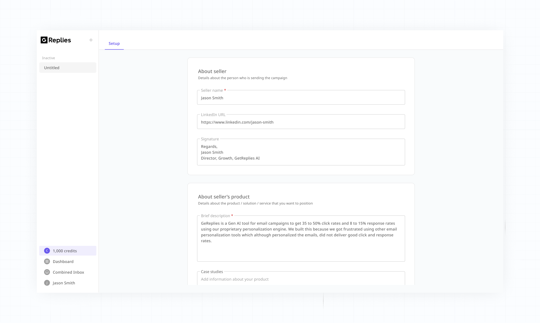 Configure campaign with basic setup about seller, product, contacts and mailbox.